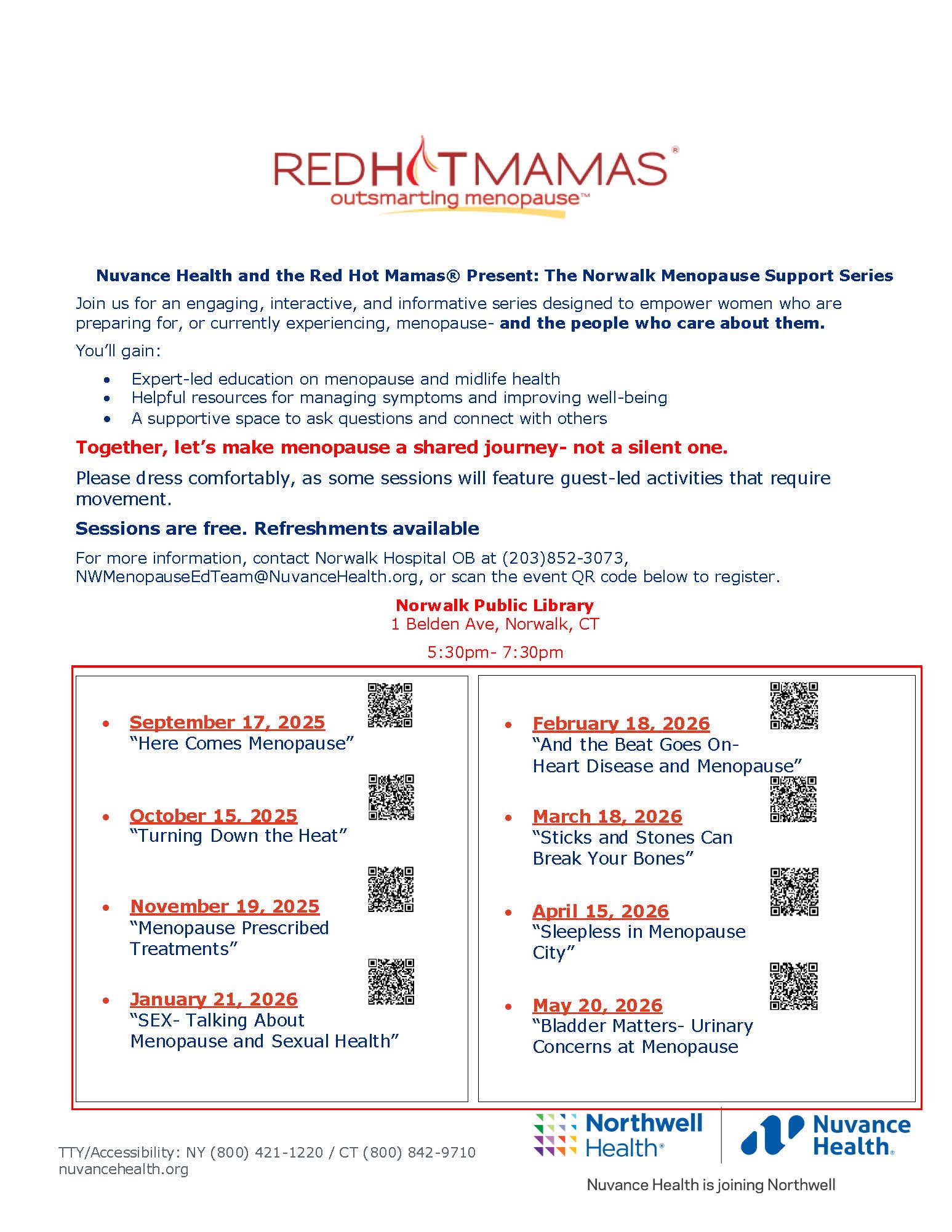Let’s give a heartfelt welcome to Nuvance Heatlh who is sponsoring two new Red Hot Mamas Programs at Norwalk Hospital and New Milford Hospitals in Connecticut. Last Wednesday, September 17th Norwalk Hospital implemented its first program with much success. Hope you can join us at New Milford Hospitals first program on September 24th. The topic is “Here Comes Menopause”.